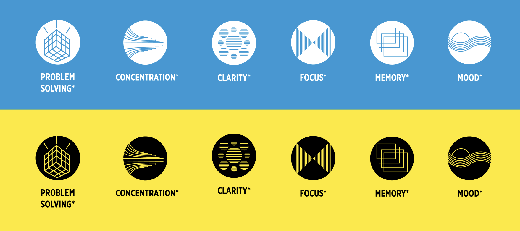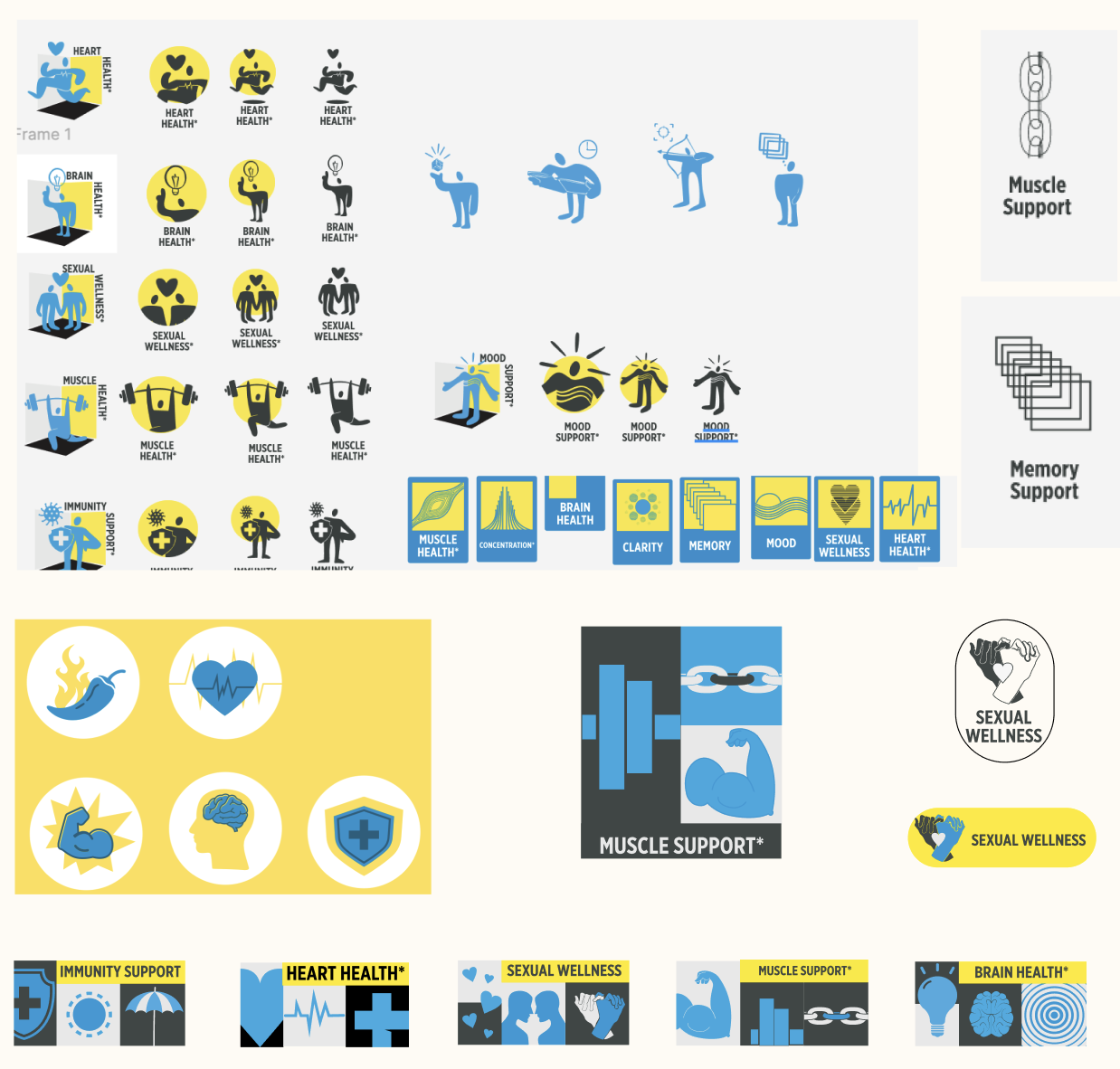 Working in collaboration with regulatory and brand teams, I began with exploratory sketchesmapped to core product claims and consumer FAQs. Icons evolved from molecule motifs and performance arrows into a family of ownable designs—each tested for legibility on packaging, mobile thumbnails, and banners. I built out usage guidelines, ensuring the icons worked in monochrome, color, and even overlay applications. I tried and tested several iterations before landing on my final set.